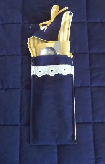 Voor het bestek en de servet heb ik een zakje gemaakt met een klepje van dubbele stof. Ik heb eerst een set bestek opgemeten en daar 12 cm in lengte bij opgeteld, voor het klepje. Dit heb ik uitgetekend op patroonpapier en daarna van 2 verschillende kleuren stof uitgeknipt. Ik heb de stofjes met de verkeerde kant op elkaar genaaid en één korte kant opengelaten om het om te keren. Daarna heb ik het op maat gevouwen en alles doorgestikt op een klein stukje van de rand. Tegelijkertijd heb ik het witte kantje mee gestikt. Tenslotte heb ik 2 drukkers op beide hoeken en net onder het kanten randje bevestigd en van lint het strikje gemaakt wat ik met borduurgaren in dezelfde kleur heb vastgemaakt.