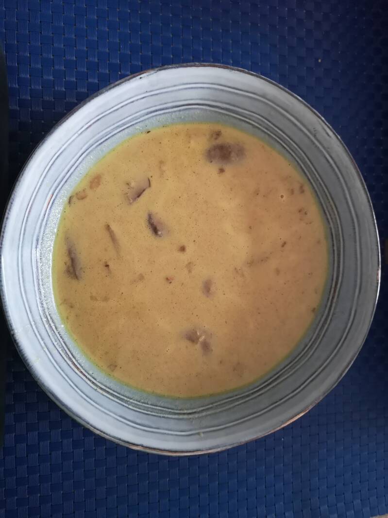 Ik heb zelf een half bakje schoongemaakte en in plakjes gesneden kastanjechampignons, wat ik over had van de vorige dag, nog even in wat olijfolie gebakken, uit laten lekken en aan de soep toegevoegd. Dit paste er wonderwel prima bij en op deze manier had ik meteen wat meer eiwitten aan de soep toegevoegd.