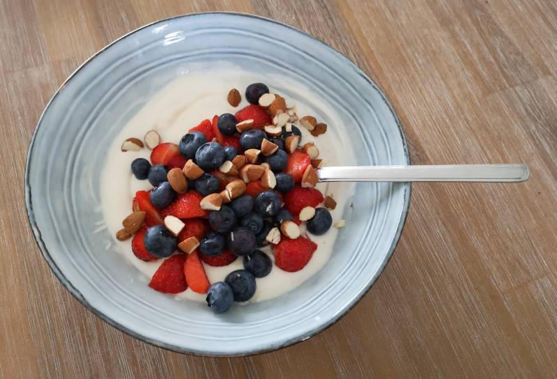 Dit is een variant op voorgaand recept wat ik heb uitgeprobeerd. De amandelen geven een extra bite. Vooral als je niet voldoende vetten binnenkrijgt op een dag, wat bij mij het geval soms is, is de toevoeging van noten een lekkere optie. Maar zoals je in de tabel onderaan kan zien, bevat het door de toevoeging van met name de blauwe bessen weer meer koolhydraten. Maar deze combinatie is ook jammie!