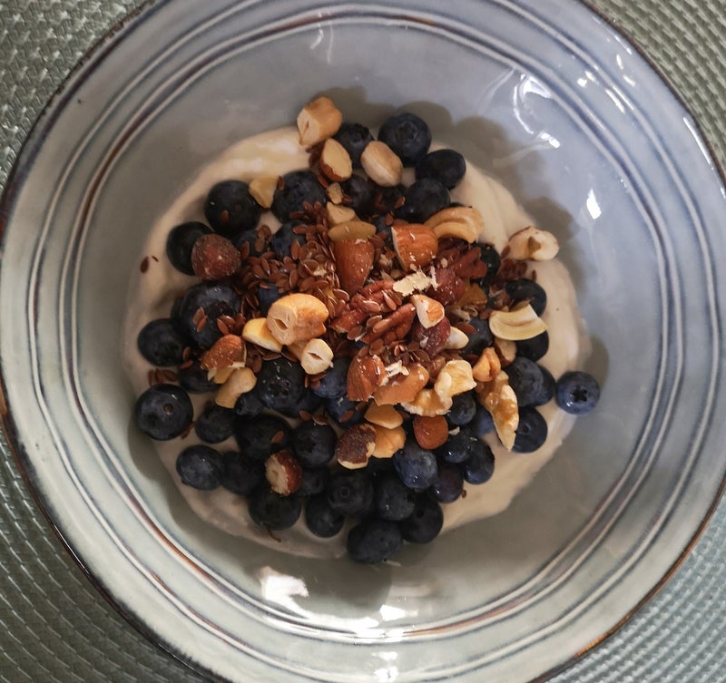 - Voeg de blauwe bessen, noten en lijnzaad aan de yoghurt toe en meng.